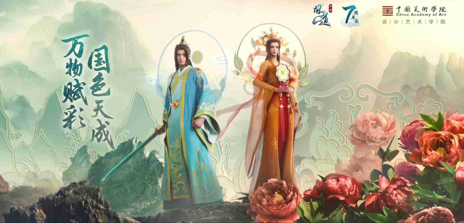 2023年4月,,,《问道手游》联动中国美术学院,,,在游戏中融合了中国历史上不同时期的文化元素,,,打造了“山河万象”与“凤鸣九霄”的国风时装。。。。在色彩配置方面,,,创作团队基于对游戏角色特性的分析提取相应的文化内涵,,从每一种色彩的色相、、、、指代事物和情感出发对应角色属性,,,选定服装的色彩搭配。。。。在纹样设计方面,,,,创作团队结合游戏角色自身特殊的造型比例和形态,,在实际的纹样设计中进行了游戏语境下的活化演绎。。。。男性角色集中使用了如蟒纹、、、、海水江崖纹、、、如意纹和云气纹等传统纹样元素,,,,女性角色则吸纳了凤凰纹、、、、牡丹纹、、、、卷草缠枝纹等元素,,,,组成以“双凤牡丹纹样”“缠枝牡丹纹”“金玉凤冠头饰”为主要纹样的游戏角色装饰图案系统。。。。